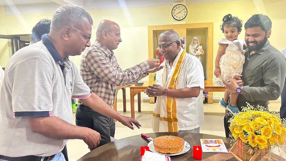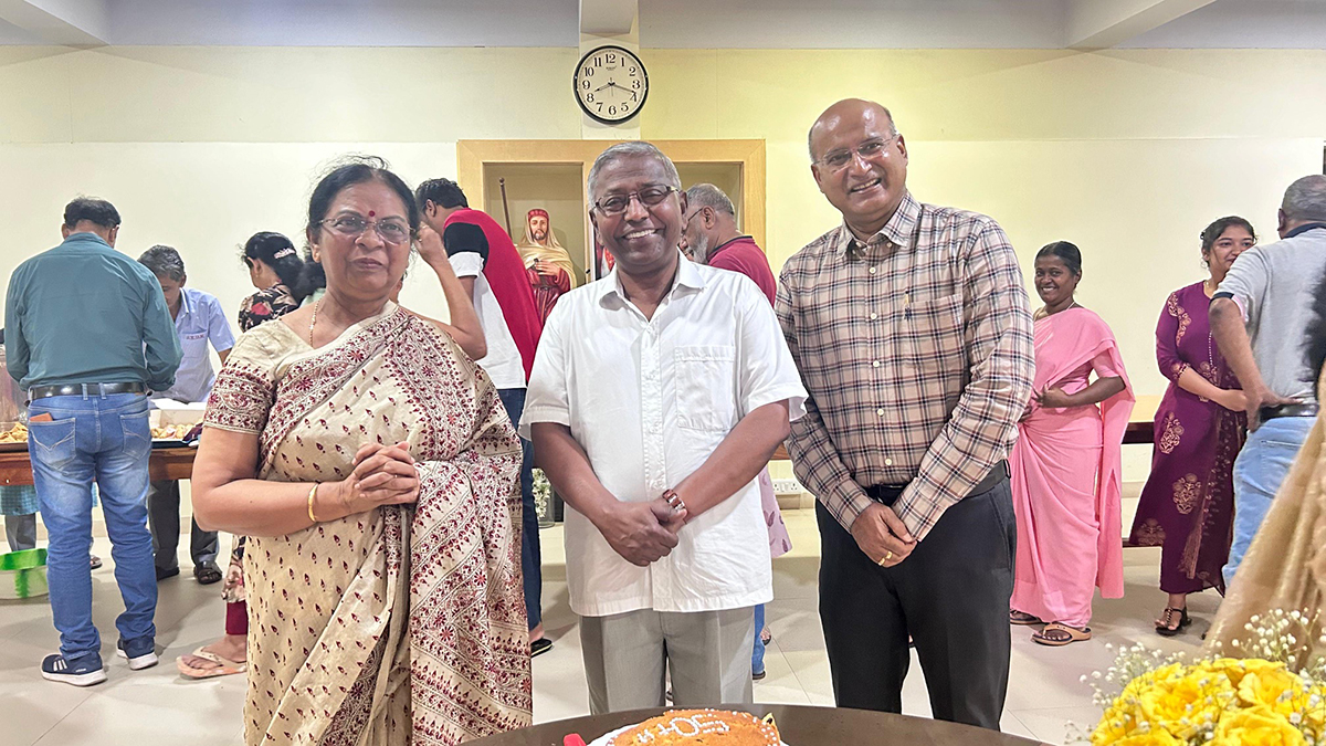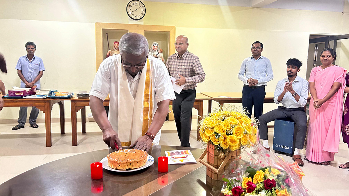 The community of faithful who come for Mass on Sundays to SXUK chapel celebrated the golden jubilee of Fr. Felix Raj on May 26, Sunday after Mass. The thanks-giving Mass was celebrated by Fr. Maria Joseph Israel who meaningfully connected the life and achievements of Fr. Felix Raj to the feast of the Trinity. The student choir led by Sisters Veronica was melodious. Sr. Esther had decorated the chapel with lovely golden-colour flowers for the occasion.