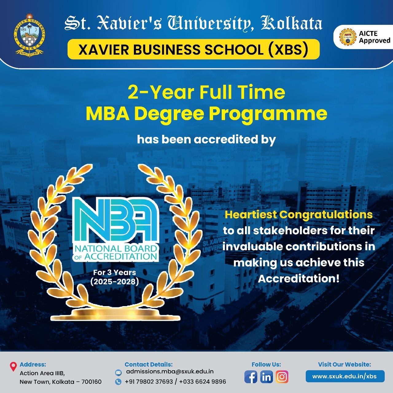 St. Xavier's University, Kolkata MBA Programme is now NBA accredited for three years.